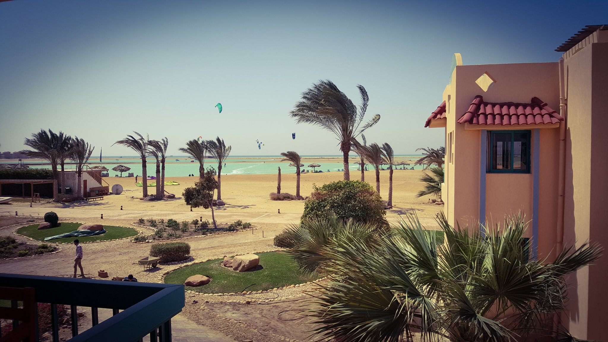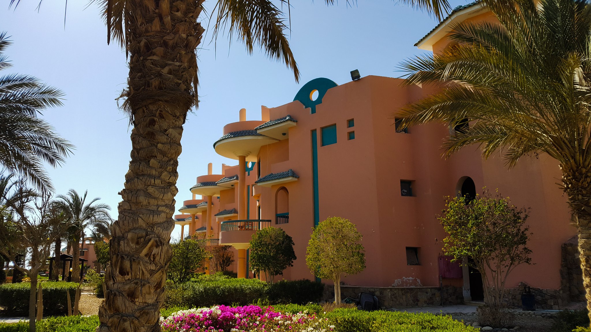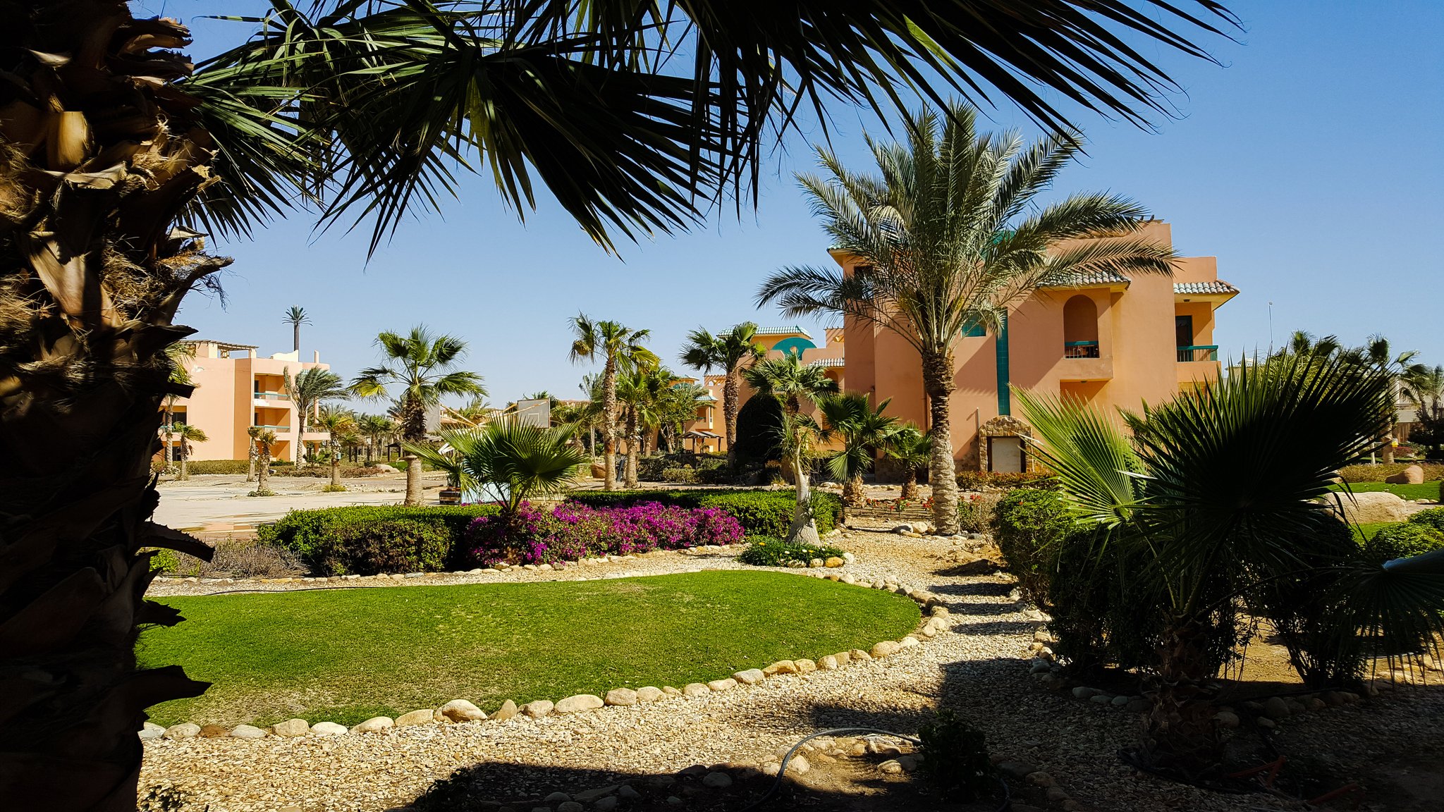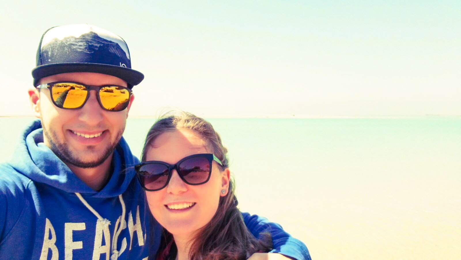 Speaking about beach holidays in Egypt, mass tourism, crowded beaches and German-speaking staff comes quickly to ones mind. Not here in Green Sudr Hotel, 30 KM behind the city of Ras Sudr, three hours from Cairo. Like all hotels along the Sinai beach strip, also our Resort is located in the middle of nowhere - or let's rather say it is surrounded by sand. The resorts to the left and right haven't opened for this season and with their forgotten construction sides it looks like ghost-towns. Seriously, there is not even a kiosk selling water outside the hotel walls... However, the hotel is as big as a village and offers everything. Green Sudr consists out of 12 buildings with 6 rooms each. A spa-building, reception hall, beach restaurant, 2 pools, a football field and a café. It is still off-season here, maybe thats why we are the only ones here. We ask the hotel staff about tourists and their answer is quite sad: even in summer season from April - November the international guests stay away due to misleading images that media creates about Sinai. However, there are some expats and Egyptian tourists coming from Cairo. But this time, it happens that Tobias and I are the only guests. 12 buildings and 15 employees only for us :) feels like king & queen. At night, it's only the guard and us. We get the best treatment possible, they offered to clean our room twice a day (we did not accept), they call our room-telephone