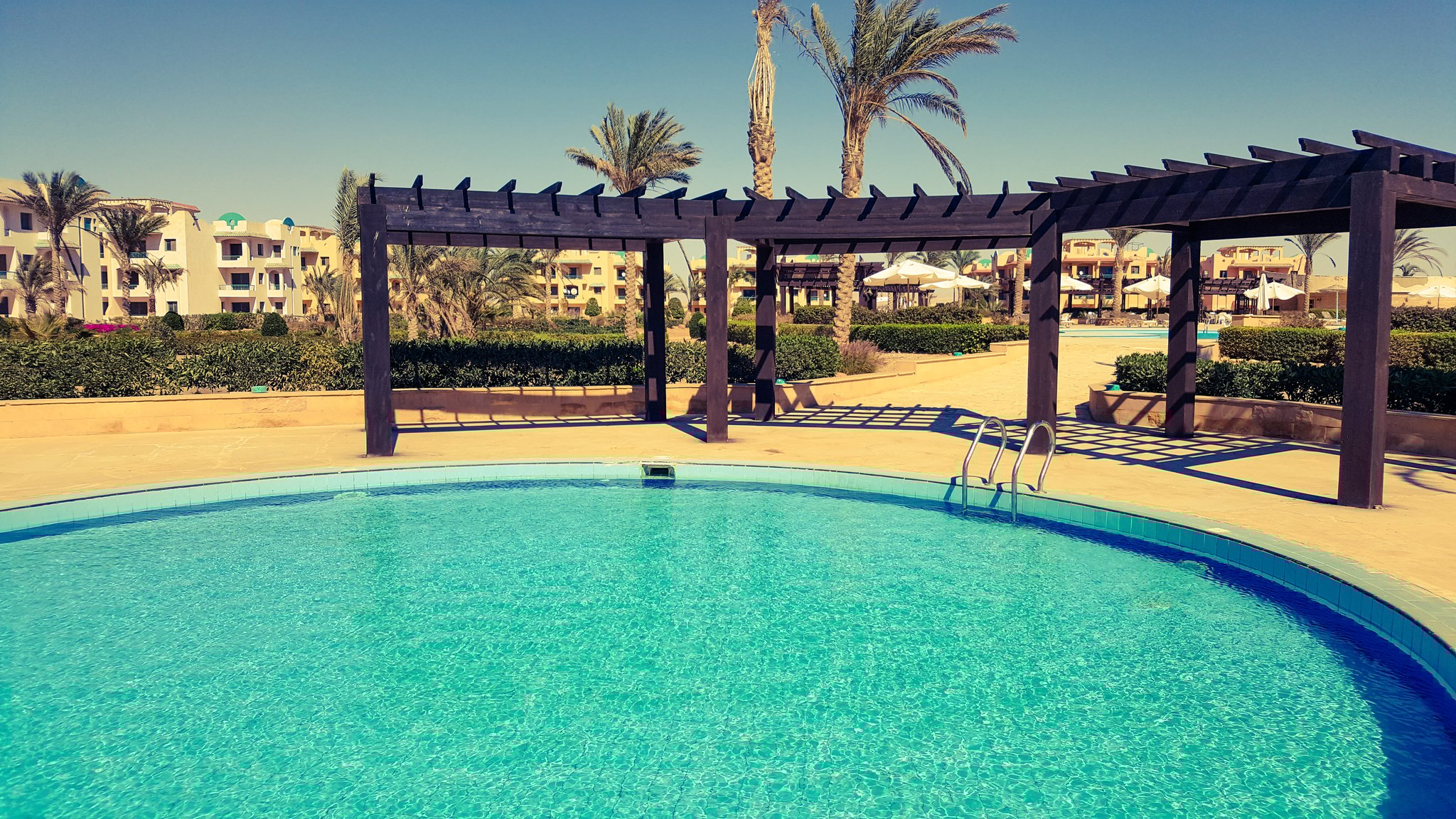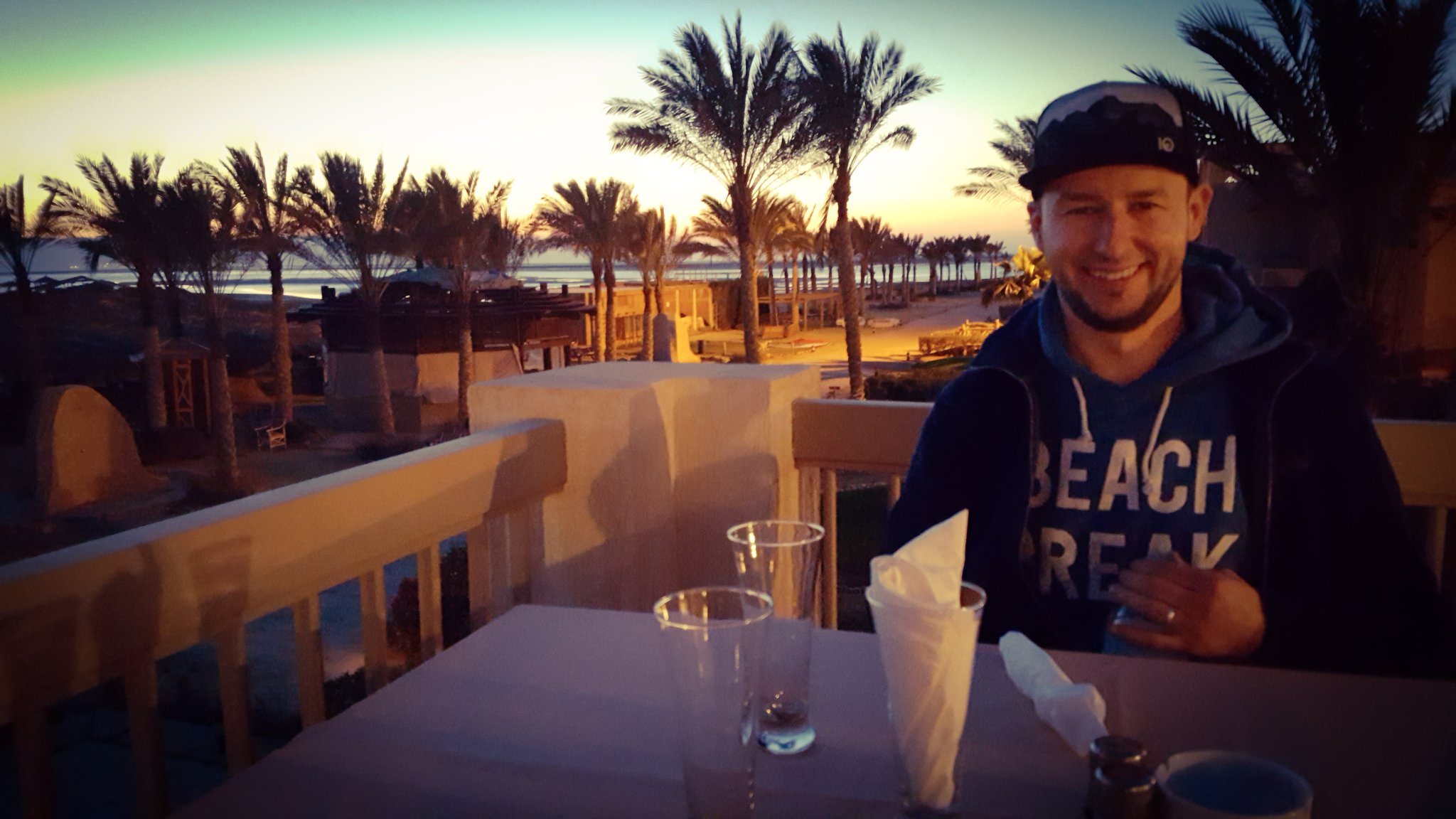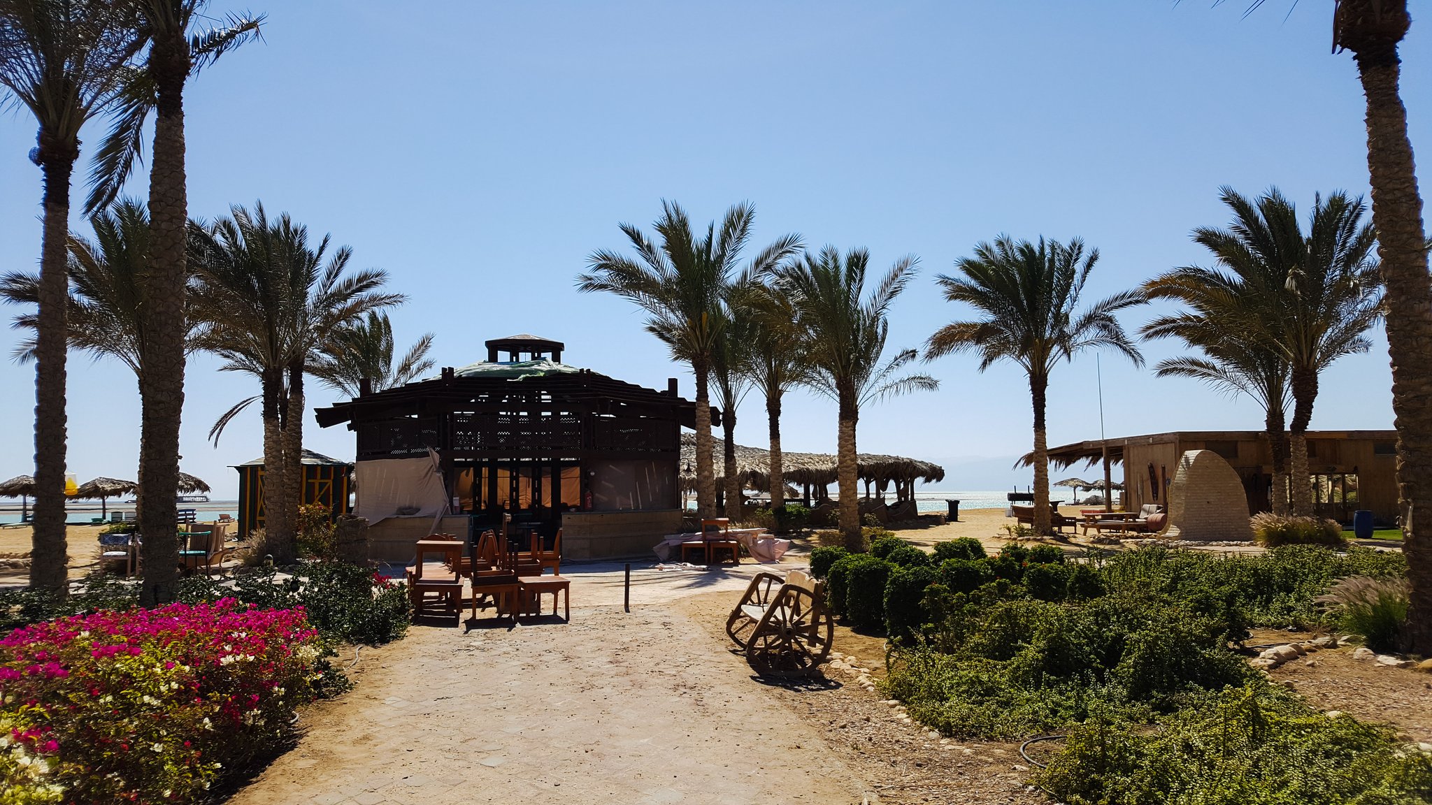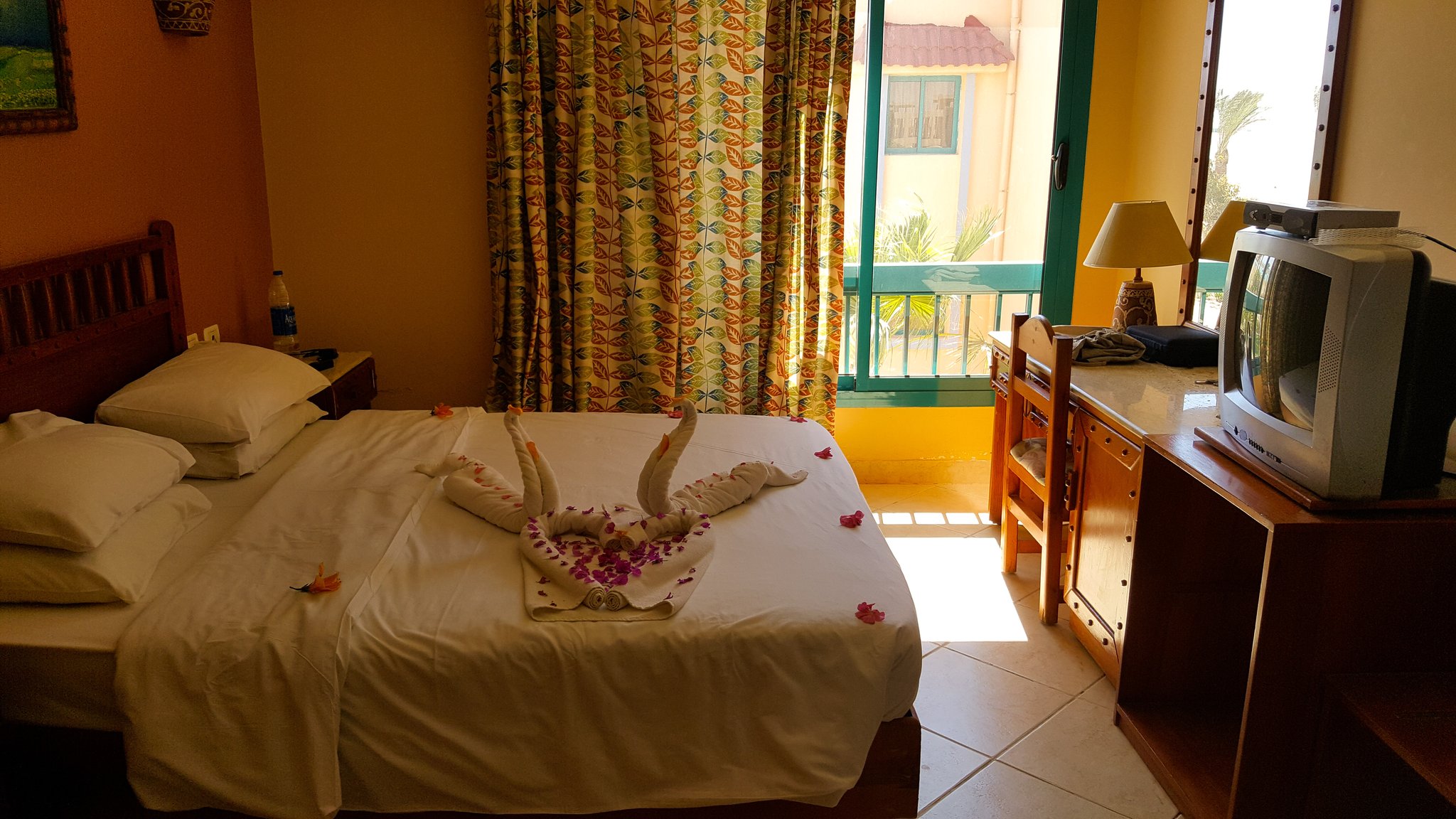 Speaking about beach holidays in Egypt, mass tourism, crowded beaches and German-speaking staff comes quickly to ones mind. Not here in Green Sudr Hotel, 30 KM behind the city of Ras Sudr, three hours from Cairo. Like all hotels along the Sinai beach strip, also our Resort is located in the middle of nowhere - or let's rather say it is surrounded by sand. The resorts to the left and right haven't opened for this season and with their forgotten construction sides it looks like ghost-towns. Seriously, there is not even a kiosk selling water outside the hotel walls... However, the hotel is as big as a village and offers everything. Green Sudr consists out of 12 buildings with 6 rooms each. A spa-building, reception hall, beach restaurant, 2 pools, a football field and a café. It is still off-season here, maybe thats why we are the only ones here. We ask the hotel staff about tourists and their answer is quite sad: even in summer season from April - November the international guests stay away due to misleading images that media creates about Sinai. However, there are some expats and Egyptian tourists coming from Cairo. But this time, it happens that Tobias and I are the only guests. 12 buildings and 15 employees only for us :) feels like king & queen. At night, it's only the guard and us. We get the best treatment possible, they offered to clean our room twice a day (we did not accept), they call our room-telephone