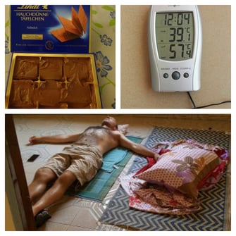 The only package of chocolate that we brought from Germany was melted after one hour in Burkina. We did not even reach the hotel and the entire thing became chocolate sauce. We go over 40° C almost every day. When you walk outside and there is a bit of wind, it hurts on your skin, because the wind is so hot. Just like walking through an oven. One day we placed the thermometer in the sun and it went up to 57° C. Our advice for the lunch break: Lying on the ground, where it is at least a bit cooler.