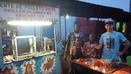 A vendor sells up to 40 chickens per day at the big market in downtown Ouagadougou. One chicken costs around 2000F (3 Euro), which you can order at the restaurant, freshly grilled, with sauce and onions for 3000F (4,50 Euro). Chicken-meat is one of the most famous dishes in Burkina Faso. It is often referred to as "poulet bicyclette", bicycle-chicken. And why? Because local sellers transport up to 50 chicken at the same time on their bike. The animals are tied by their feet and then hanged onto the handlebar head-down. Alive of course. Chickens are big business in Burkina: Over 30 millions animal are being breed every year. Each family keeps chicken also as an insurance. If somebody falls sick or they need money quickly for an emergency, they are simply going to sell two or three of their chicken. Speaken as a vegetarian, I have to admit, it is truely delicious!