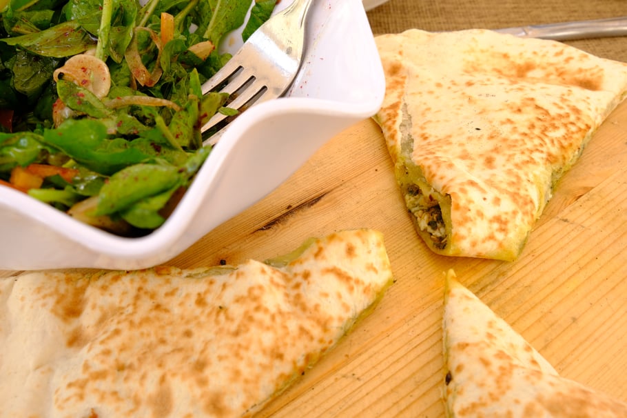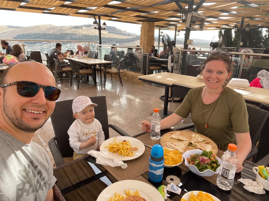 Endlich Essen. Von der Open-Air Terrasse des Restaurants blickt man in drei Richtungen auf unterschiedliche Berge. Arabische Musik läuft im Hintergrund, es ist schwer noch einen Platz zu bekommen. So wie ich es mitbekomme, sind die meisten hier jordanische Tagesausflügler mit Kindern aus Amman. Die Menükarte macht es mir schwer, mich zu entscheiden. Ich frage nach etwas vegetarischem und vertraue blind darauf, dass das richtige kommen wird. Ich habe keine Ahnung was ich bestellt habe. Nach einer kurzen Wartezeit kommt eine Art Pizzabrot mit Feta und Thymian und einen super frischen Rucola-Salat. Hmmmm...es schmeckt fantastisch.