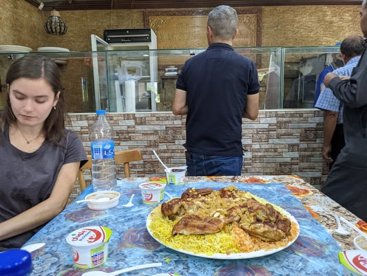 Zum Mittag haben wir Mandi gegessen, ein Gericht, dass ursprünglich aus dem Jemen stammt, aber hier sehr beliebt ist. Es ist eines meiner Lieblingsgerichte. Kaum haben wir uns an den Tisch gesetzt, stand auch schon ein Teller mit 5 verschiedenen Reissorten vor uns. Wir alle haben fleißig angefangen zu essen. Nach ein paar Minuten nimmt man uns den Teller wieder weg und wir sind ganz verwundert...Das war gar nicht das Mittagessen, das war das Testessen um die Reissorte zu wählen, die wir möchten. Haha.