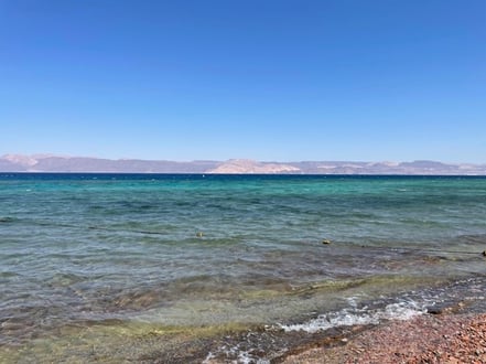 South Beach: Wer nach Aqaba kommt, muss unbedingt auch die 20-minütige Fahrt zum South Beach auf sich nehmen. Schon die Fahrt ist ein Erlebnis. So dicht am Meer fährt man an Sandstränden entlang. Ägypten ist nicht weit entfernt und man kann Surfer auch auf der anderen Seite erkennen. Der wolkenfreie Himmel und das Meer strahlen in den sattesten Blautönen um die Wette. Palmenblätter wehen im leichten Wind und leuchten regelrecht durch die Anstrahlung der Sonne. In South Beach hat man die Strände für sich. An einem kleinen Kiosk kann man nur das nötigste Kaufen: Wasser, Sonnencreme, ein paar Snacks. Auch unser Hostel liegt am South Beach, das gleichzeitig auch Fischrestaurant und Tauchschule ist.