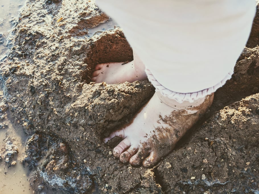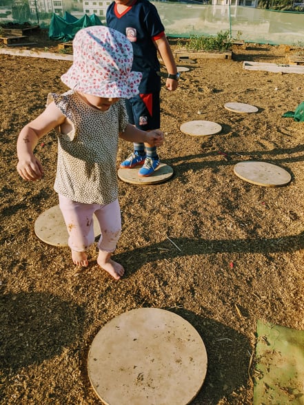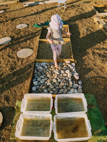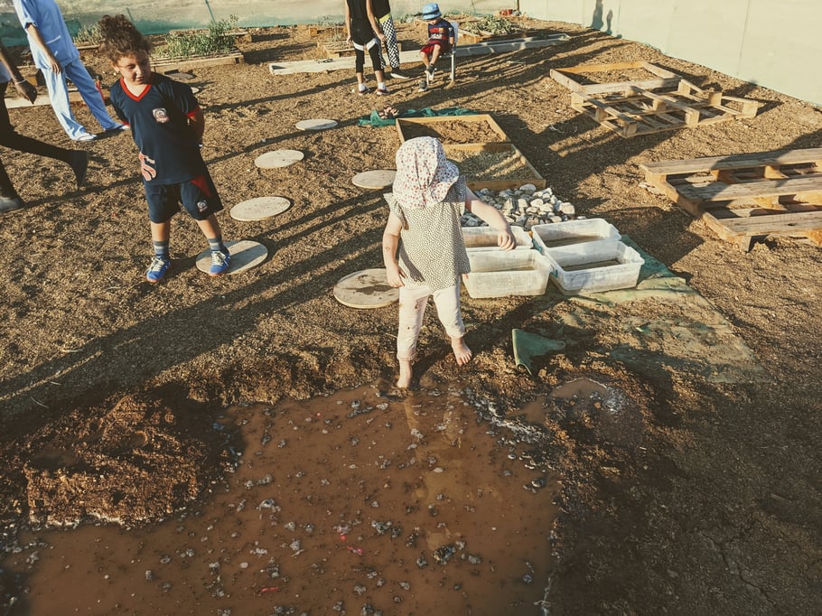 Am Ende erwatet alle dann noch das große Finale: Ohne Rücksicht auf Verluste wird ein großes Loch gegraben, mit Wasser befüllt und kurz trocknen gelassen...Fertig ist eine riesige Matschepfütze. Die Kinder dürfen drin baden, reinspringen oder spritzen....Johanna findet, dass ihre Füße zu dreckig dadrin werden. Deshalb hüpft sie lieber weiterhin über den Sensory-Pfad. Das ist ein Barfußpfad, wo es vier unterschiedliche Materialen zu fühlen gibt: Erde, Rindenmulch, Steine und Wasser. Auf dem Rückweg springt man von Kreis zu Kreis.