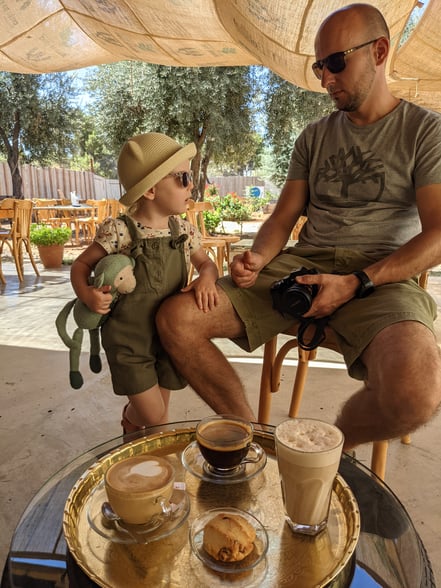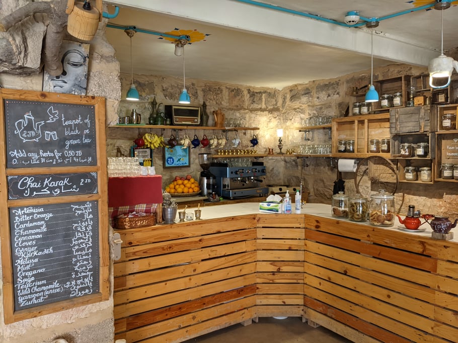 Wir bestellen das in Jordanien berühmte Getränk "Karak Chai" und lassen den Blumengarten auf uns wirken.