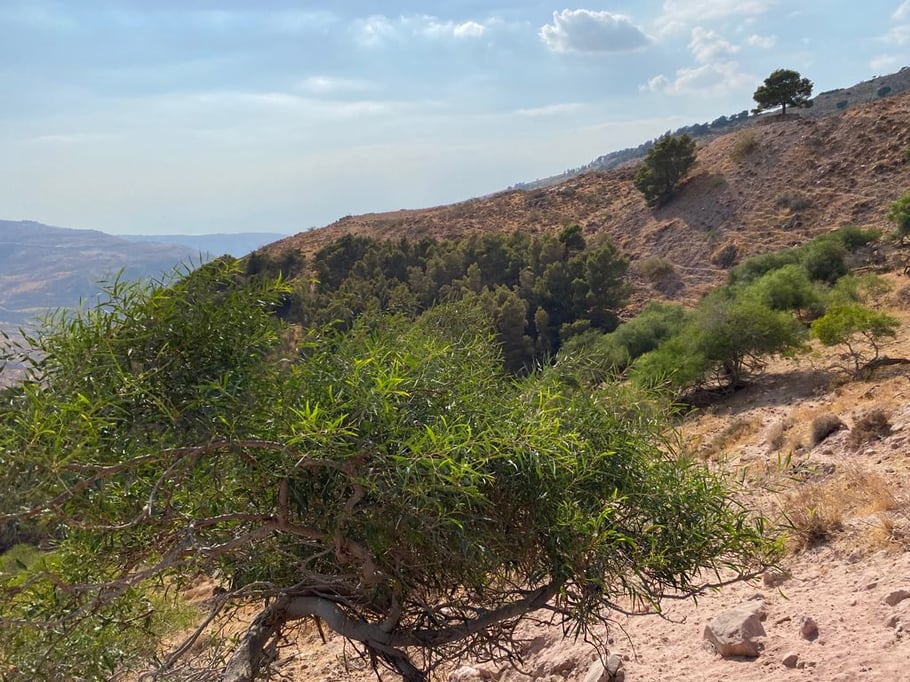 Nach der ersten Kurve blickt man nur noch über die Berge und ins Tal. Die Wohnsiedlung haben wir hinter uns gelassen. die Luft ist frisch und es ist auch etwas kühler als in Amman. Jede Kurve macht neugierig, was sich dahinter wohl wieder für ein neuer Ausblick zeigt.