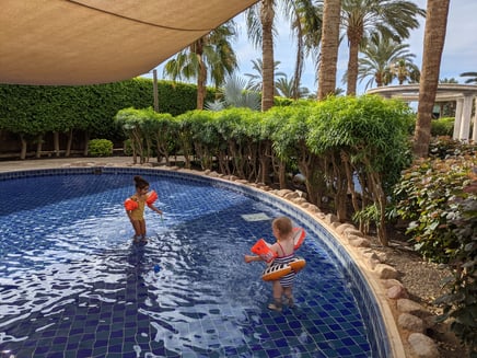 Die erste Nacht haben wir in Aqaba South Beach verbracht, in einem sehr familienfreundlichen und empfehlenswerten Hostel. Das Bedouin Garden Village verfügt über einen Pool, community areas und Dachterassen mit eindrucksvollen Aussichten. Das Frühstück ist inklusive. Es liegt 50m vom öffentlichen Strand mit Spielplatz entfernt.