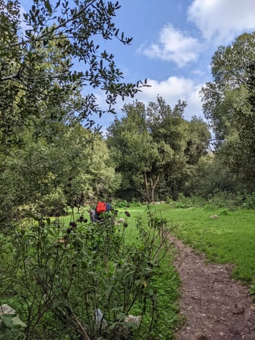 Es ist gar nicht so einfach den Anfang von dem Waldweg zu finden. Man muss die Wiese ganz hintunter gehen. Wenn man den "Eingang" einmal gefunden hat, ist es ziemlich offensichtlich. Auch gibt es rot-weiße Markierungen an der Seite des Pfads.