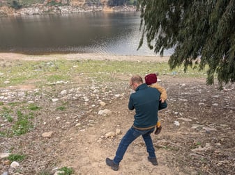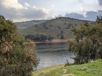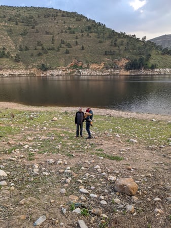Der Bin Talal Dam liegt eine Stunde nördlich von Amman und macht ein nettes Halb-Tages-Ziel zum Spaziergehen. Der Damm ist eigentlich eingezäunt, aber an einer Stelle wurde der Zaun geöffnet. Viele andere Besucher und Angler waren ebenfalls unterwegs, die diesen "halb-offiziellen" Eingang nutzen. Auf einem kleinen Trampelpfad gelangt man an die Ufer des Damms.