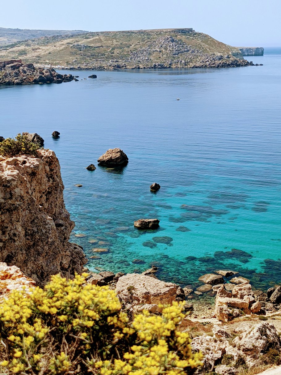 An vielen bergigen Stellen auf Malta kann man die gesamte Breite der Insel überblicken. Dann sieht man sowohl das Meer im Osten, als auch die Buchten im Westen. Und es wird einem wieder einmal klar, wie klein die Insel ist. Dadurch kann man aber von fast allen Orten in Malta auf das Meer blicken. Und die Ausblicke nach einer Kurve oder nachdem man einen weiteren Berg hochgefahren ist, sind sensationell. Am eindrucksvollsten sind die steilen, felsigen Klippen, die in türkises Meerwasser münden.