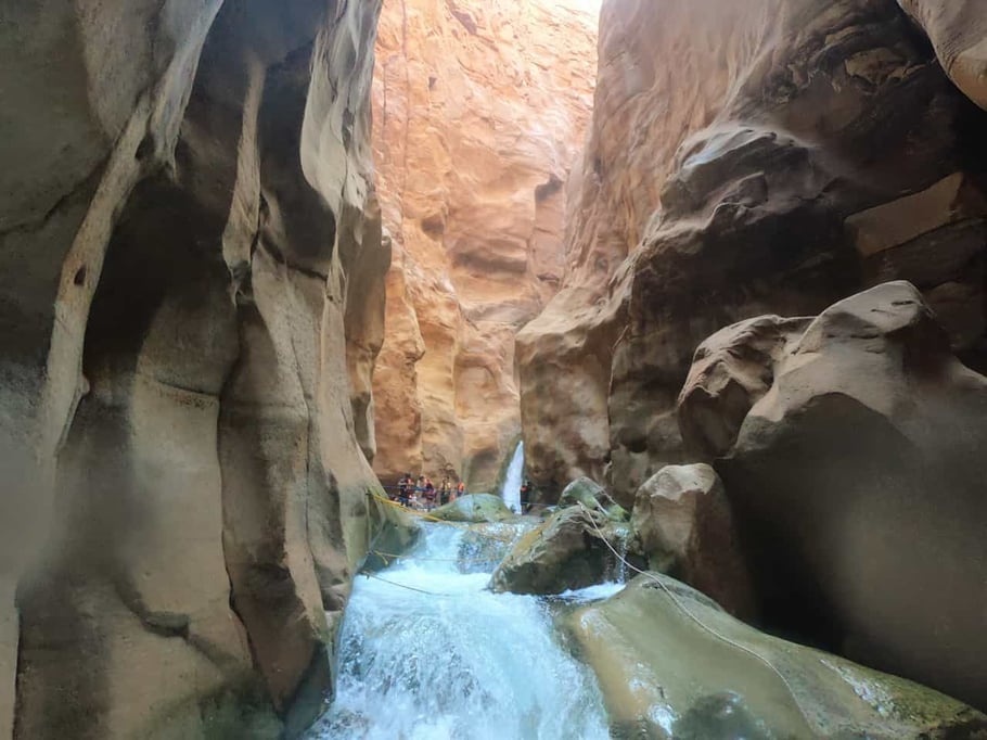 Wadi Mujib is an adventurous destination for adrenalin-lovers. You are going to hike through the valley of Wadi Mujib, which keeps water all year round. So be sure, your feet will always be inside the water, and most part of it you are actually going to swim. At the Adventure Center they will give you life-jackets. You are going to hike/climb in total six little waterfalls until you reach a very big waterfall, where you can relax and swim. (If you still need more swimming). To climb the little waterfalls, you follow the ropes and ladders that were set up there. Definitely expect that e v e r y t h i n g will get completely wet....