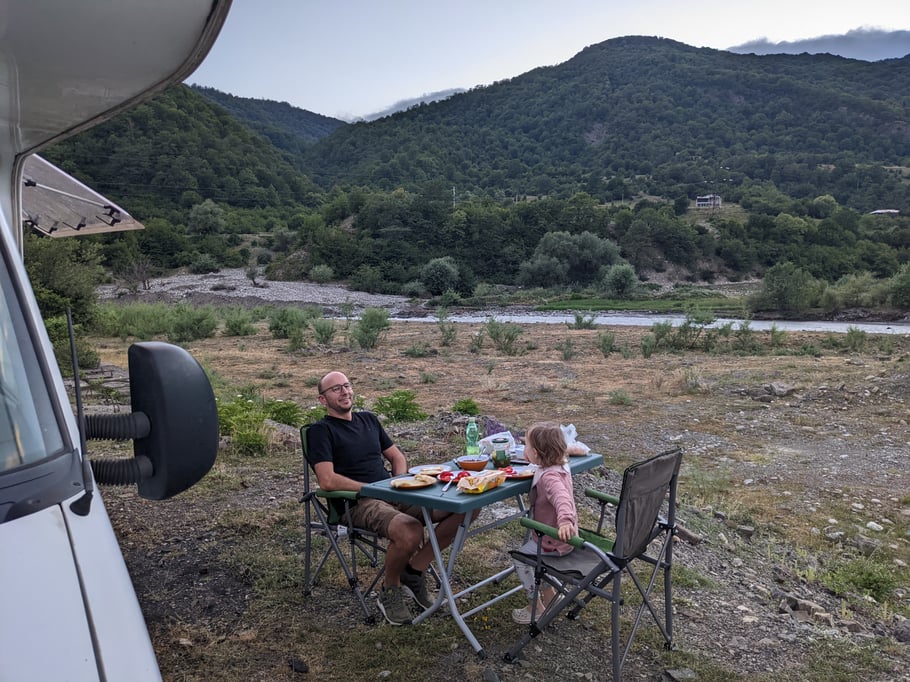 Actually, how we ended up here was funny. We identified a perfect night spot fro the other side of the lake....and tried to reach it. Unfortunatly, two collapsed bridges and a gravel path that was ways too steap for our motor home, made it impossible to find the selected spot. So we gave up in a different location and found one other Van with two travellers from France....they wanted to go to exavtly the same spot, but ther van is also not 4x4....united through the story how we ended up there, we spent the night outside our vans together, with French wine and Georgian beer.