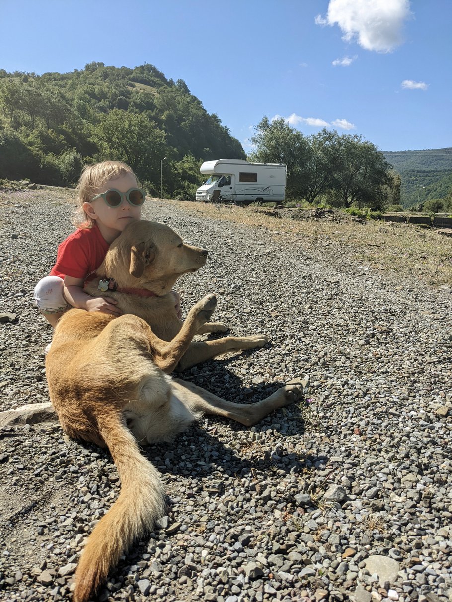 It was more or less an last-second-emergeny-stop and not planned to stay here. We though we move much quicker and reach our next stop earlier. But driving up and down the Caucasus Mountains around Stepantsminda takes much much longer as what Google suggests. Especially with a Motor Home. We were so tired and without any patience. We just wanted to play outside. And then we found this: River, Farm, Football Pitch. And our Motor Home right in between, just off the road. Some contact to the local people included :)