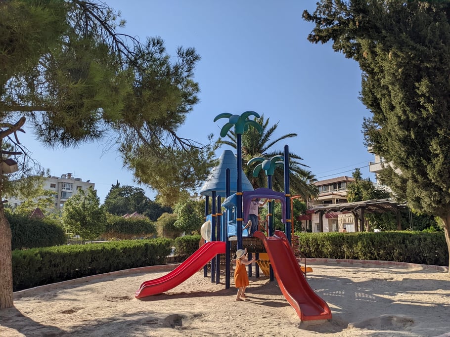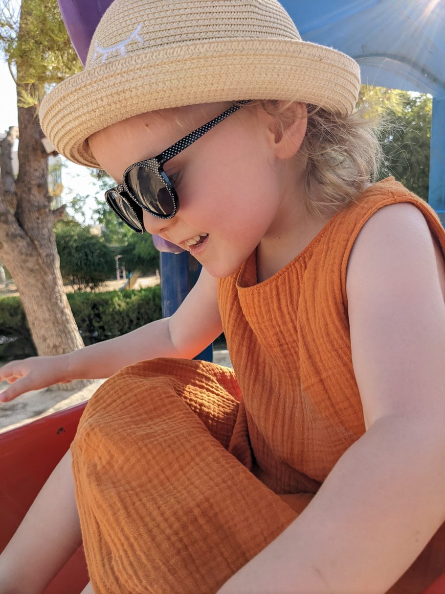 Gleich zu Beginn haben die Kinder natürlich den großen Spielturm entdeckt und wollten dann auch erst mal auf dem Spielplatz anfangen. Schön ist, dass ein paar Bäume hier auch Schatten spenden. Der sandige Untergrund hat es sogar möglich gemacht, dass Johanna barfuß spielen kann.
