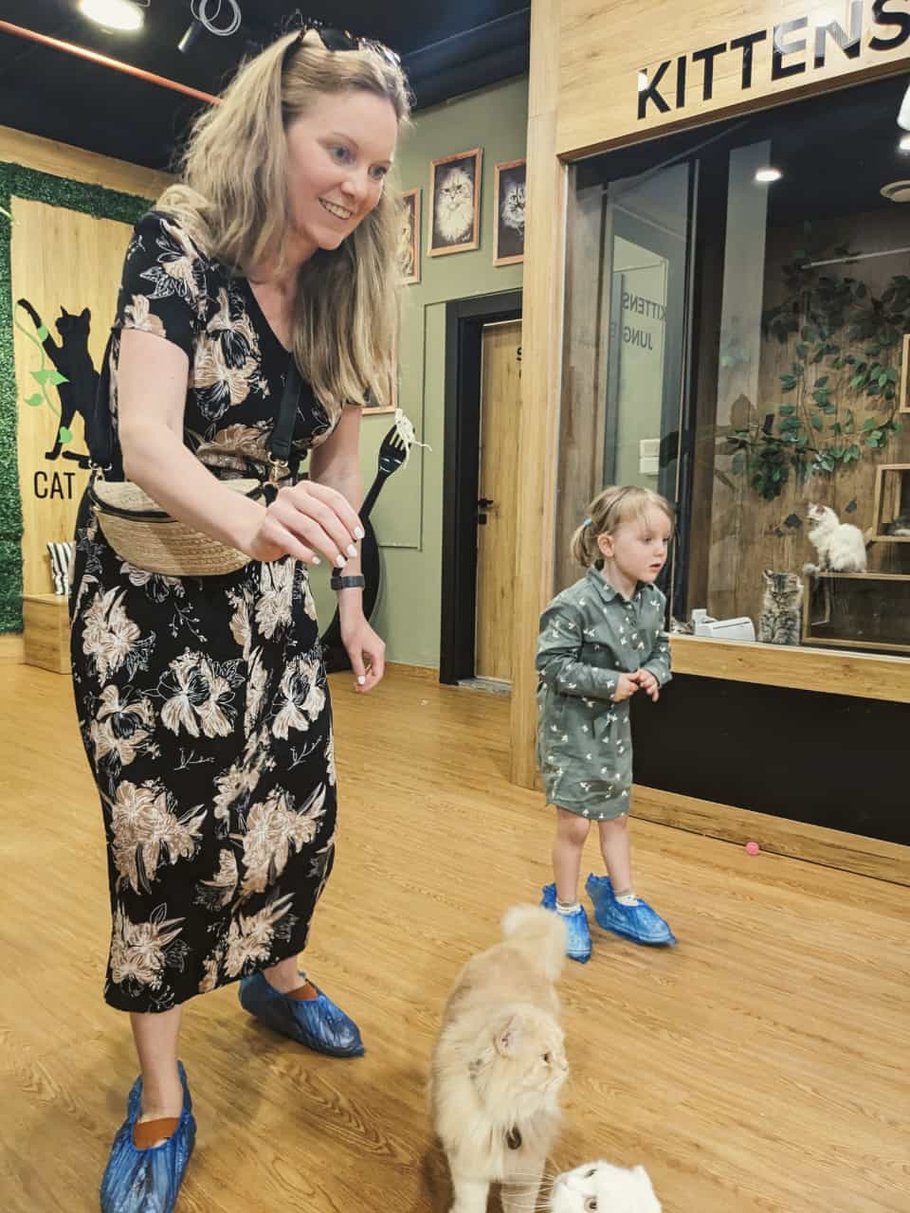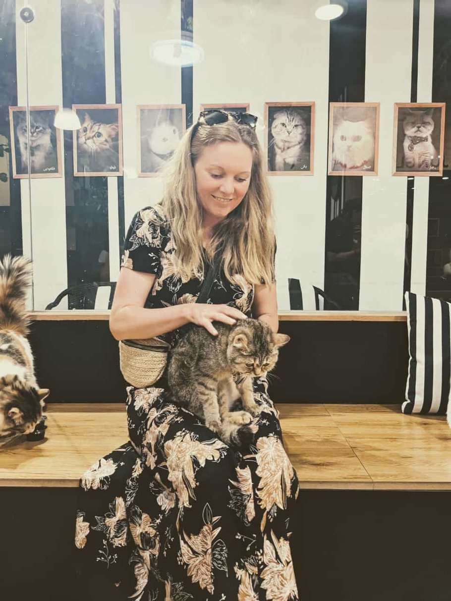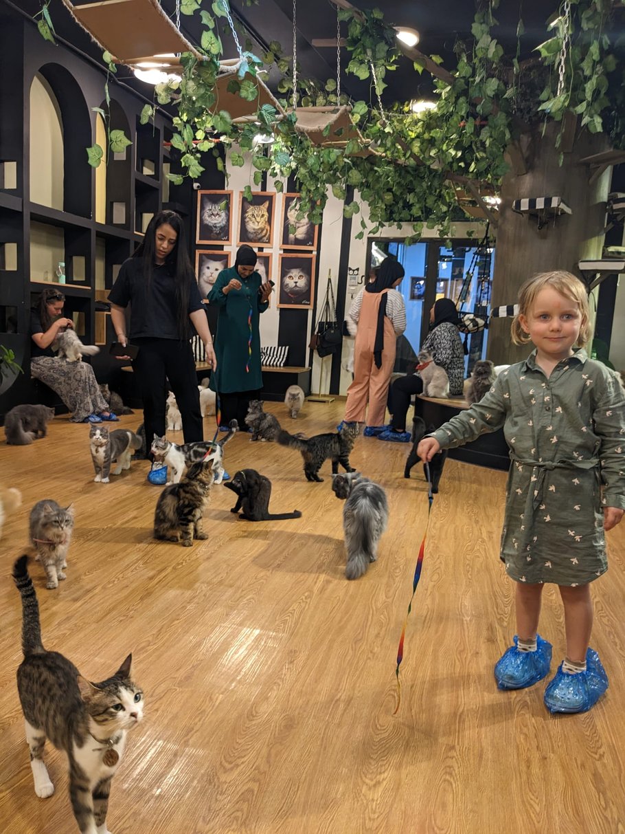 Four Dinar for half an hour in a room full of cats. The idea sounds bizarre but the room is always crowded. No pre-booking needed, you can enter on the spot. Someone had this genius idea and now it totally works. The place is very, very clean and tidy...totally unexpected with so many cats in one room. It seems that they have a good life, though they get fed a lot. Including in your ticket is not only the cuteness of the cats but also: brushing, feeding, playing, cuddling. And for that the friendly employees of Cat Jungle provide you with some cat snacks, toys and special brushes for all type of hair. Johanna was a bit overwhelmed and enjoyed more observing than touching.