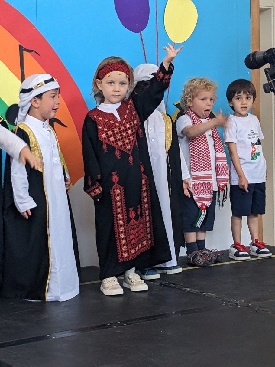 My credit really goes to her two teachers, Carol and Sawsan, who invested month in this "show". Each child also had a line on the microphone. Most of them could cope with the stage fever, however a few kids decided to not participate after seeing the crowd of guests - which I totally understand. They are so young.