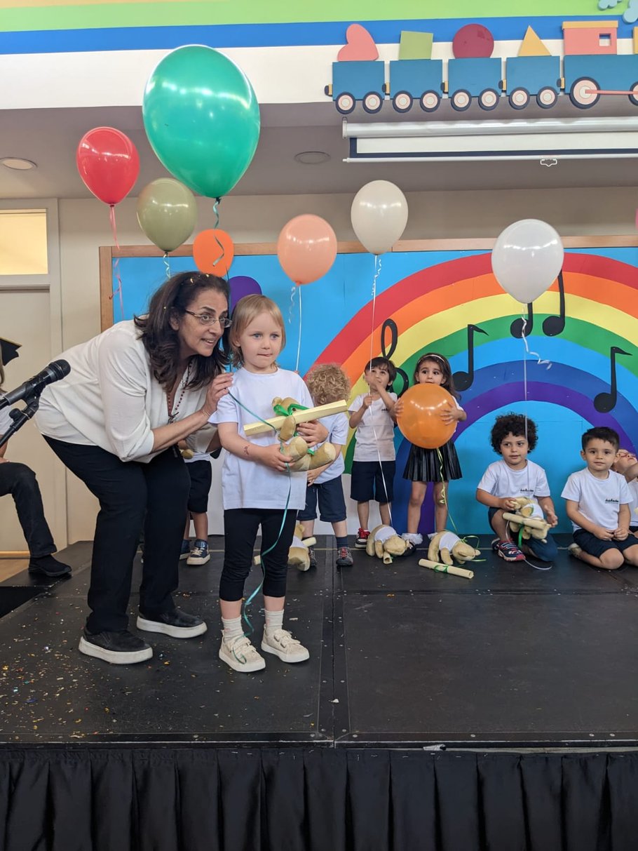 The songs were a collected of typical kindergarden songs (I am a music man) and tradition Arabic music as well as the Jordanian national anthem. Above in the photo you see a little Dabke performance, this is the Jordanian National Dance, which one can see on weddings or public celebrations. Below in the photo, you see the principal handing over a little surprise to each child. This was already so emotional...cannot imagine how it will be once she does her university graduation or driving license :)))