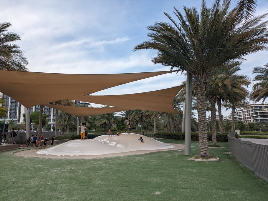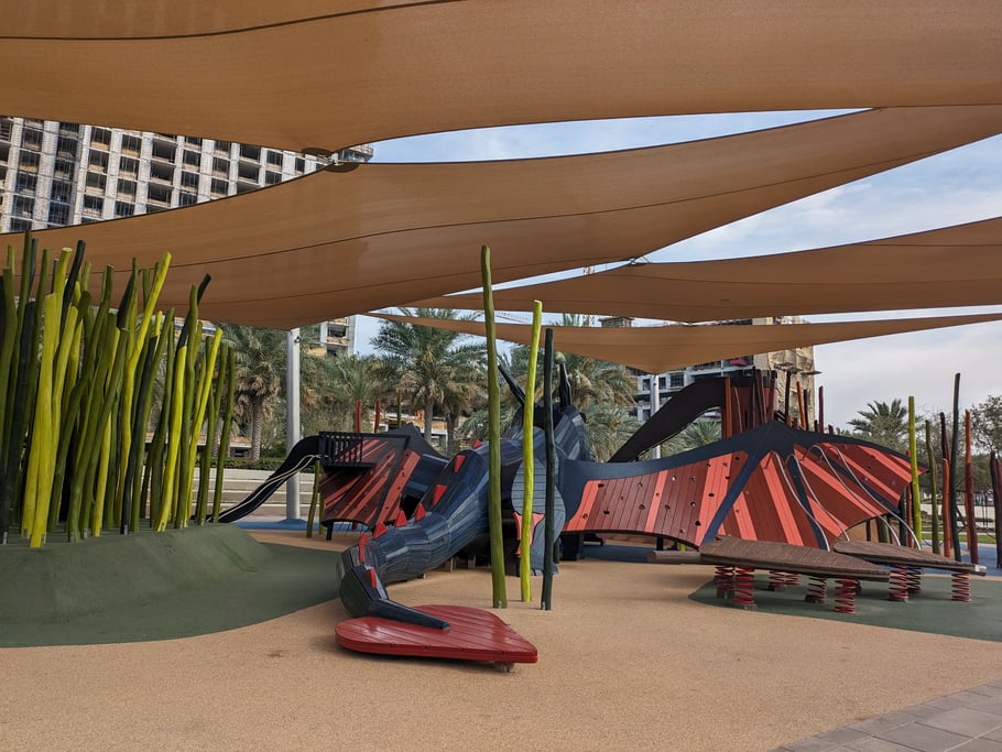 Dubai Hills is one of the high-end communities in Dubai. And so look the play areas! Everything is just perfect and there is a big park for kids to run, too. This playground is called "Dragon Play Area", its on Google Maps, and totally free of charge.