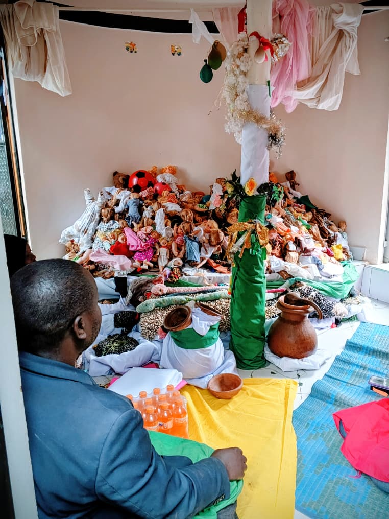 In another banda (round house), naked dolls are stacked on top of each other. What initially looks a bit creepy has a very beautiful meaning: here, believers can pray for twins. In Uganda, twins have a special cultural and spiritual significance. In many Ugandan cultures, twins are seen as something supernatural or spiritual. They are often considered a sign of blessing, luck, or special power—not a coincidence. In the Ugandan language, there are even special words for “father of twins” and “mother of twins.”
