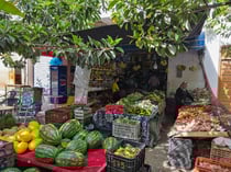 Sieht dieser Platz nicht traumhaft schön aus? Das ist unser Gemüsehändler des Vertrauens, fünf Minuten zu Fuß von uns. Fast das gesamte Sortiment kommt aus Marokko selbst. Zum Einkaufen bekommt man große Plastikschalen, in die einfach alles reingeworfen werden kann. Gewogen wird alles zusammen - Paprikas mit Orangen und Kartoffeln zum Beispiel. Praktisch & Schnell. Für 20 Eurocents kann man sich dann noch eine frische Gewürzmischung zusammen stellen lassen. Auf jedes Gericht neu...