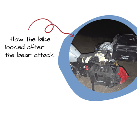 und das Motorrad wieder auf festen Boden ziehen konnten. In der Türkei griff ein Braunbär das Motorrad nachts an, riss es wortwörtlich in Einzelteile. Am nächsten morgen setzten die beiden ihre