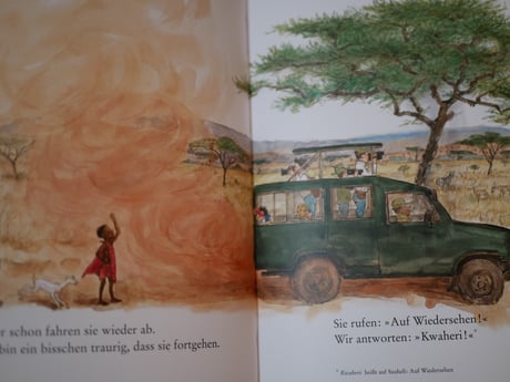 Das Buch überzeugt durch die fantastischen Tier-Zeichnungen. Ein kleines Mädchen, das auf Safari ist, vergisst ihren Teddy. Der einheimische Junge findet ihn und