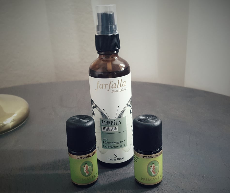 Neben den üblichen Tipps (lange Kleidung aus Baumwolle tragen, die Dämmerung meidenm etc.) kann man für Babys ein natürliches Moskitospray mischen. Die Basis dafür stellt Hamamelis-Wasser. Man nehme: