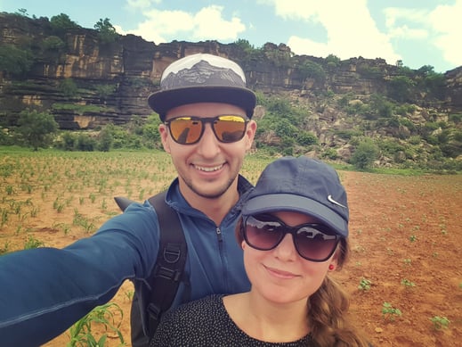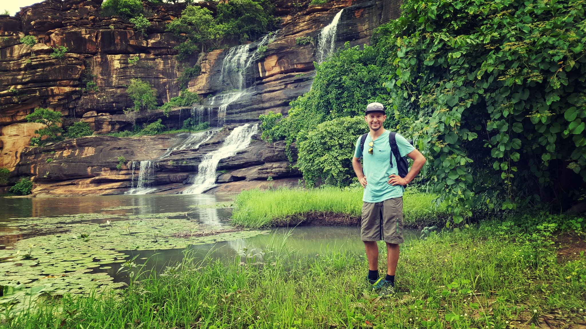 Almost there! Now it is time to follow the street to Namponkoré. You can also ask for the village of Logbau, because it lies on the same road. We drove slowly through the village of Namponkoré and couldn't trust our eyes: A waterfall. Literally on the right hand-side before crossing the bridge. The waterfall is not far away from the main-village-road, maybe a 15-minutes walk. The landscape, the waterfall and the high cliffs are stunning. We took our time also to take a walk around the fields. BUT: This is not all. We even found a second, bigger waterfall.